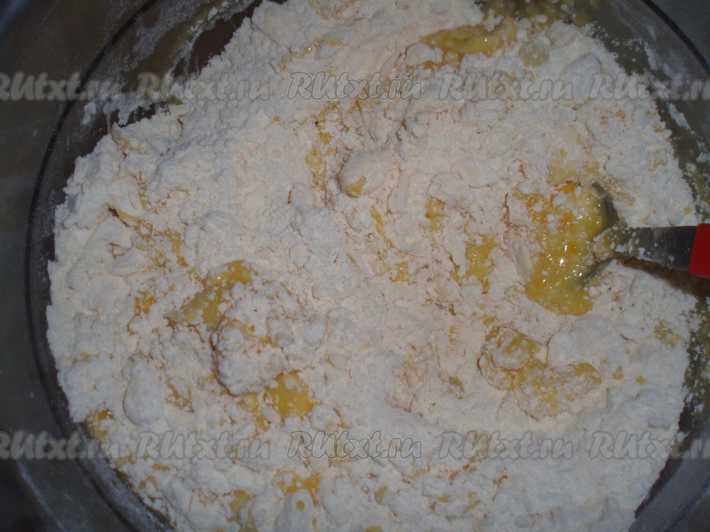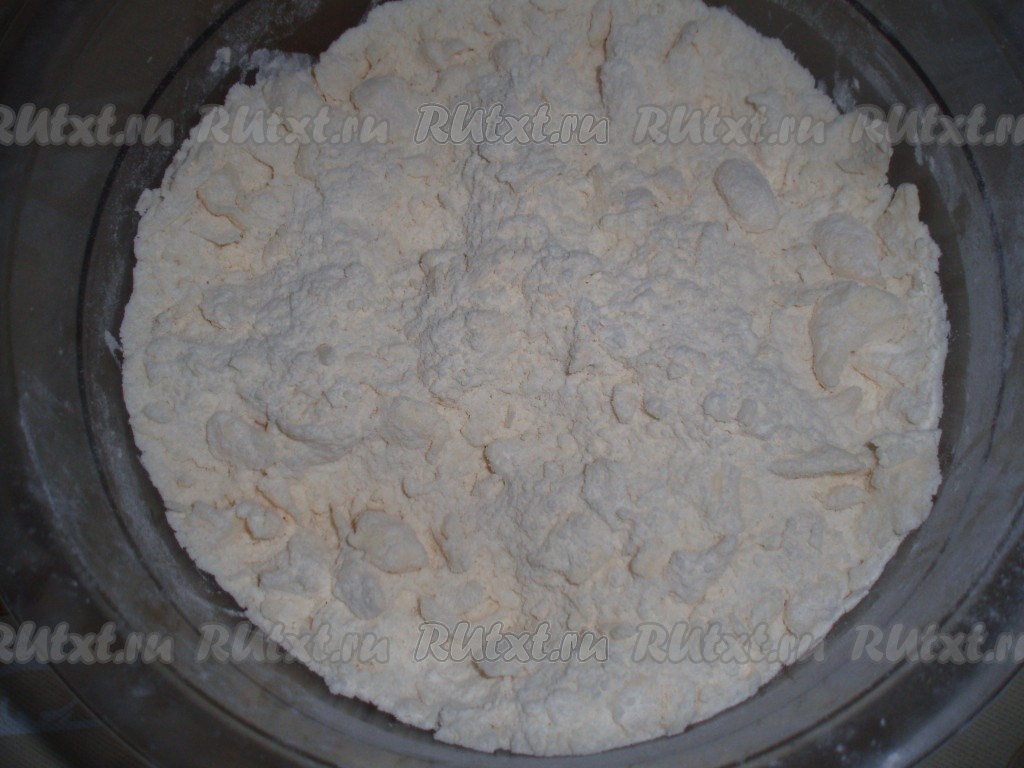 Просеять муку вместе с сахарной пудрой. В смесь муки и сахарной пудры нарезать сливочное масло кусочками и перемешать до образования крошки.