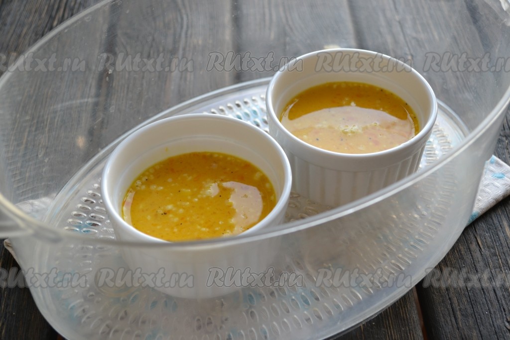 Вылить подготовленную массу в чашу пароварки или в порционные формочки, заполняя их на 1/3 объёма. Можно использовать как керамические, так и силиконовые формочки.