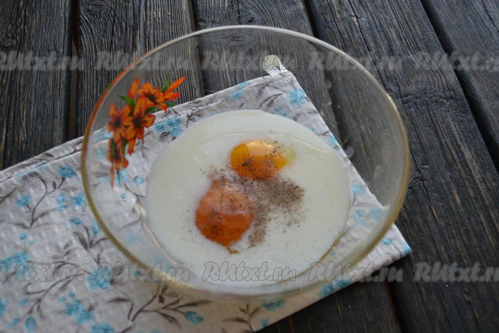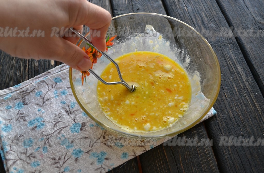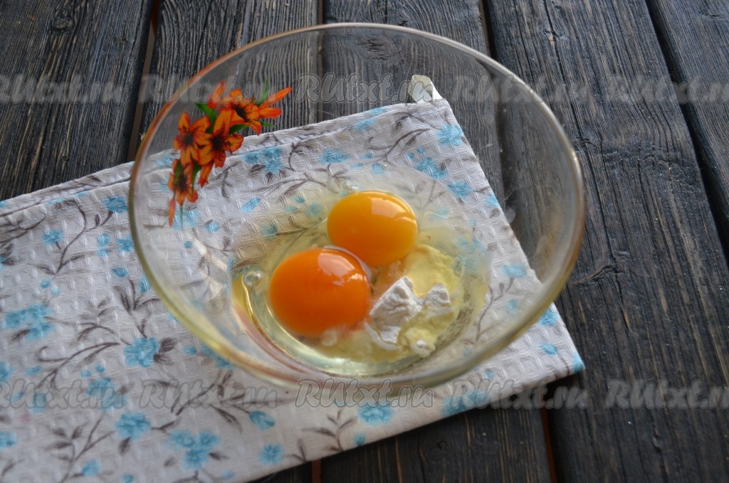 В миску всыпать соду, муку, добавить яйца. Если использовать домашние яйца, омлет приобретет насыщенный, красивый желтый цвет.