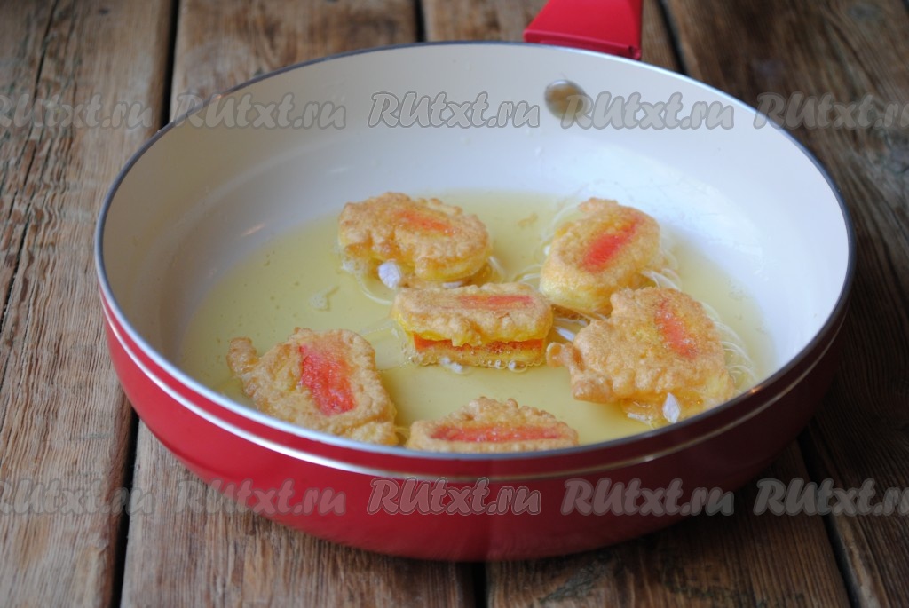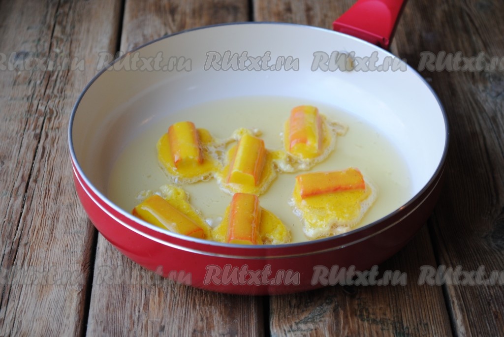 Обмакнуть крабовые палочки в кляр. Жарить на сковороде, разогретой с растительным маслом, на среднем огне до золотистого цвета (примерно, по 1-2 минуте с каждой стороны).