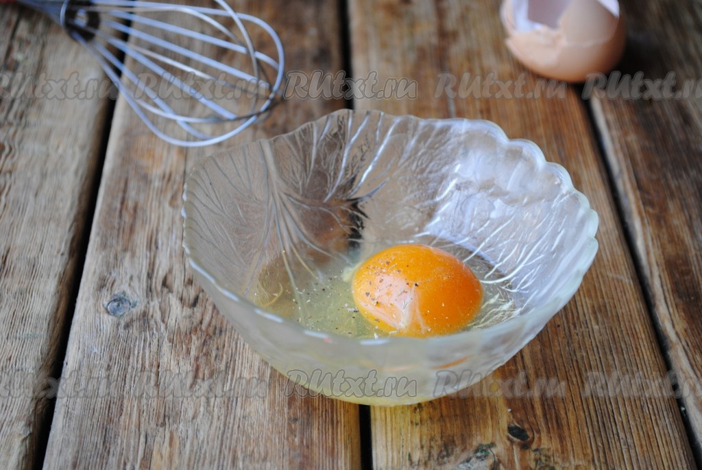 Яйцо вбить в миску, добавить чёрный молотый перец и соль.