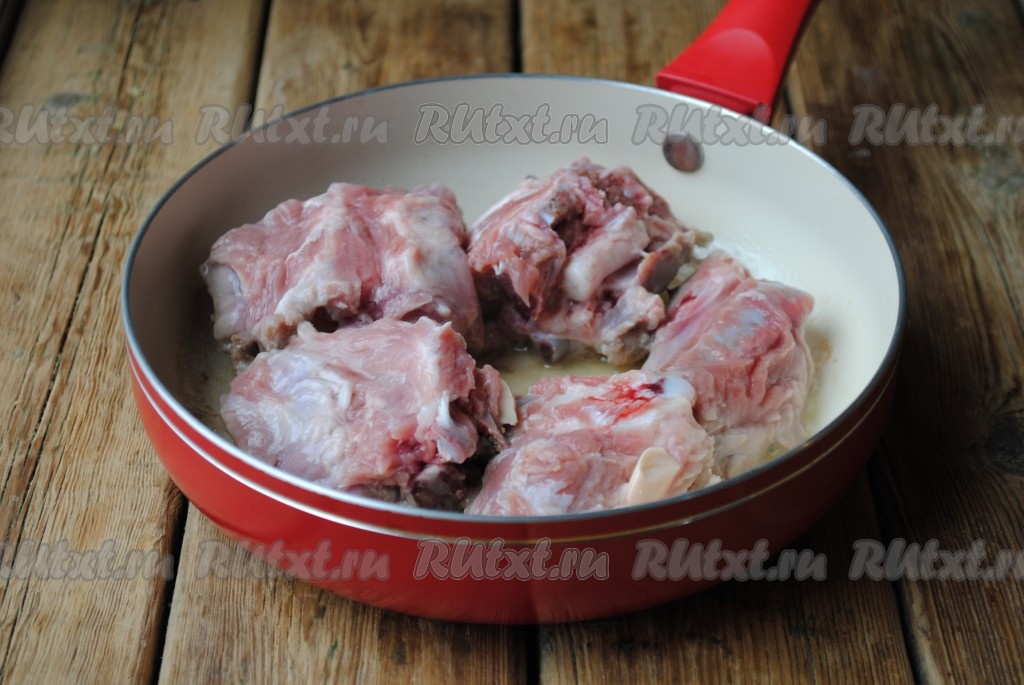 В сковороде разогреть растительное масло или вытопить курдючный жир. Выложить кусочки баранины.