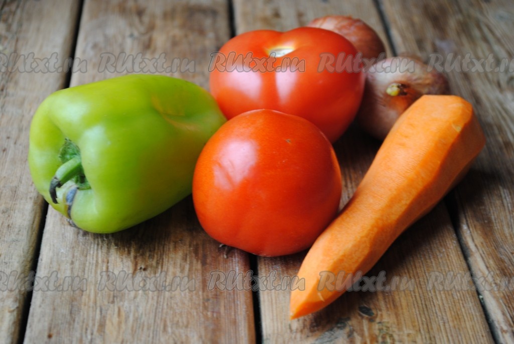Пока жарится мясо, нужно подготовить овощи. Лук очистить и нарезать полукольцами, если лук очень крупный - то можно четверть кольцами. Морковь очистить и нарезать брусочками. Перец разрезать пополам и, очистив от семян, нарезать соломкой. Помидоры нарезать крупными кубиками. По желанию, перед нарезанием помидоры можно опустить на пару секунд в кипяток, а затем снять кожицу.
