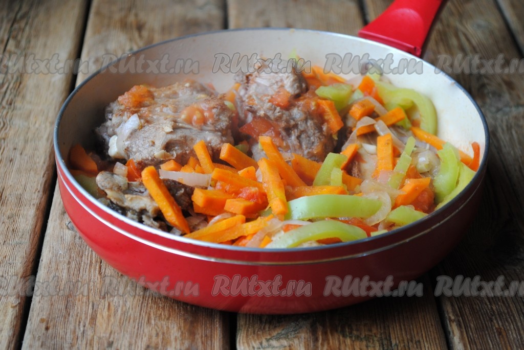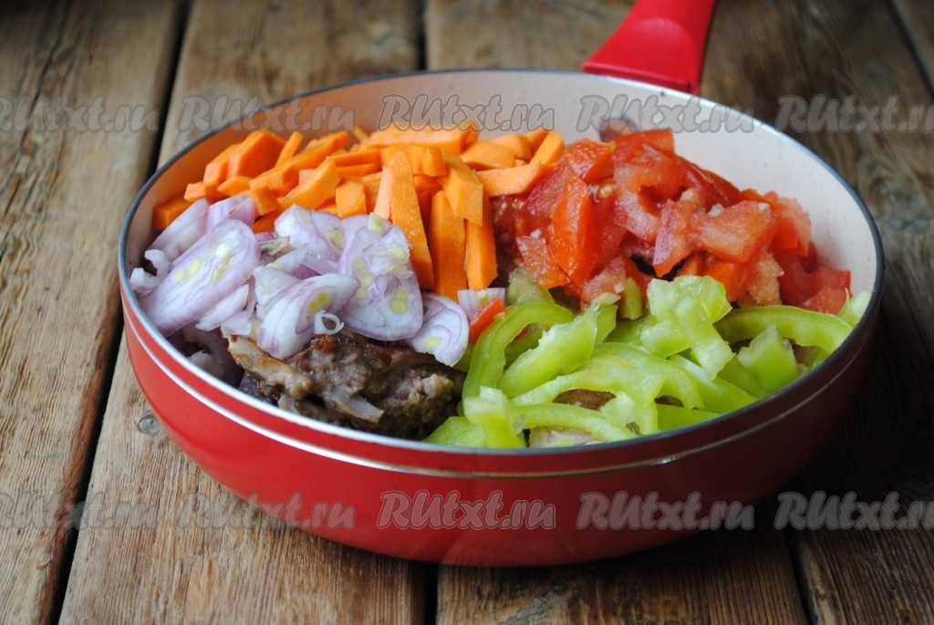 Нарезанные овощи отправить в сковороду к обжаренному мясу.