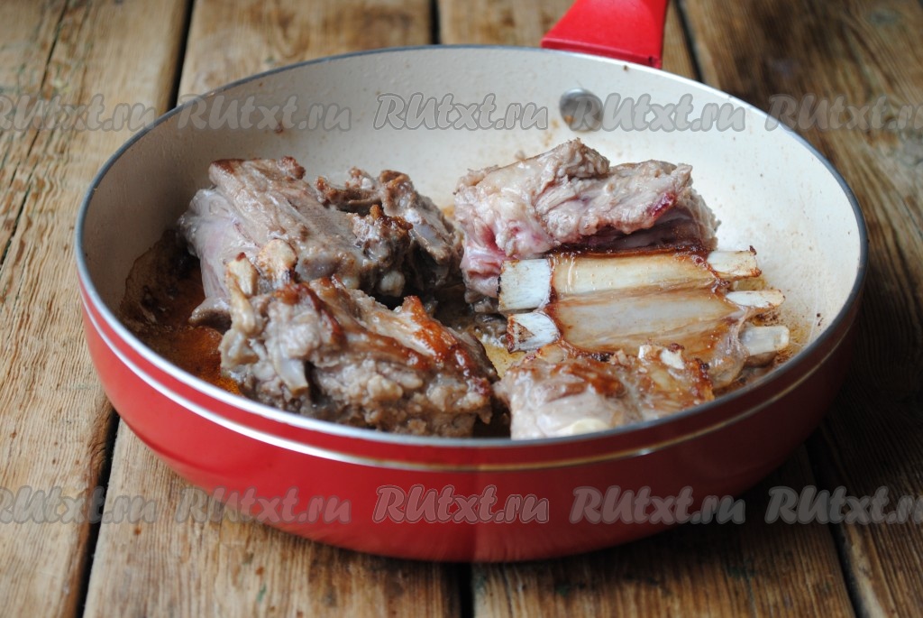 Обжарить кусочки баранины на сильном огне до золотистой корочки со всех сторон. Наша задача не приготовить мясо, а именно обжарить до корочки, которая сохранит все соки внутри мяса.