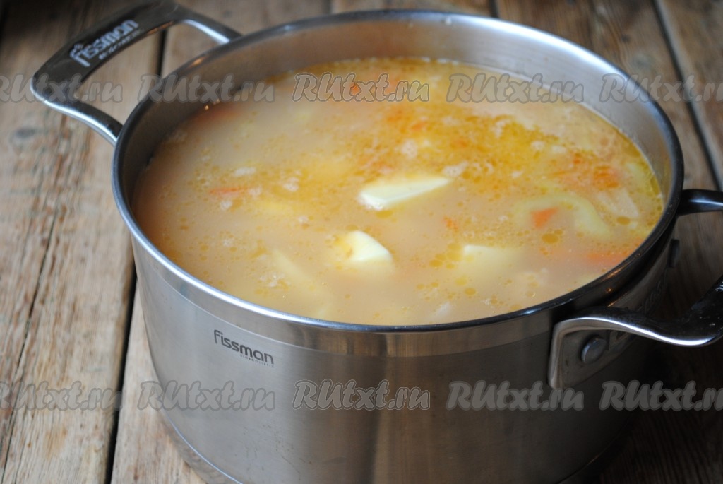 По истечении указанного времени опустить картофель в кастрюлю. Готовить 10-15 минут (до мягкости картофеля).