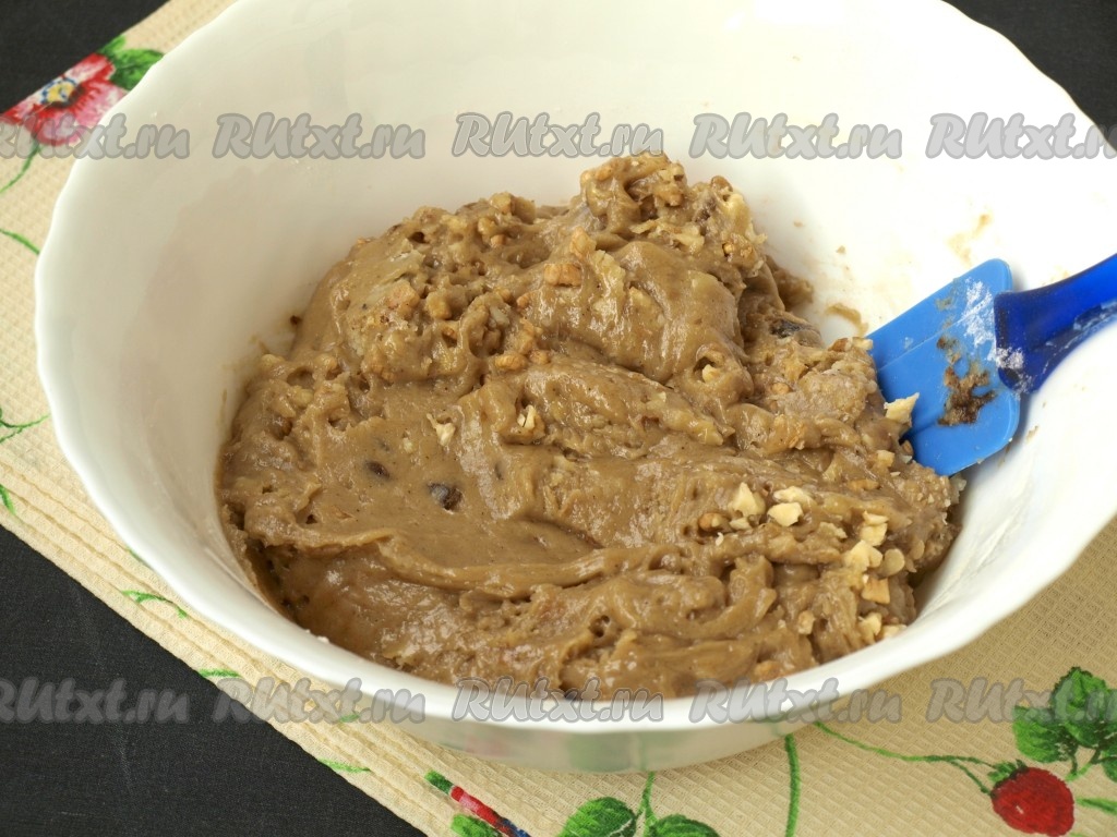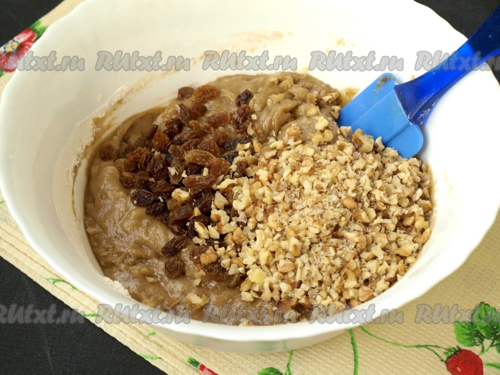 Массу хорошо размешать и добавить промытый и обсушенный изюм, а также измельчённые грецкие орехи, ещё раз перемешать.