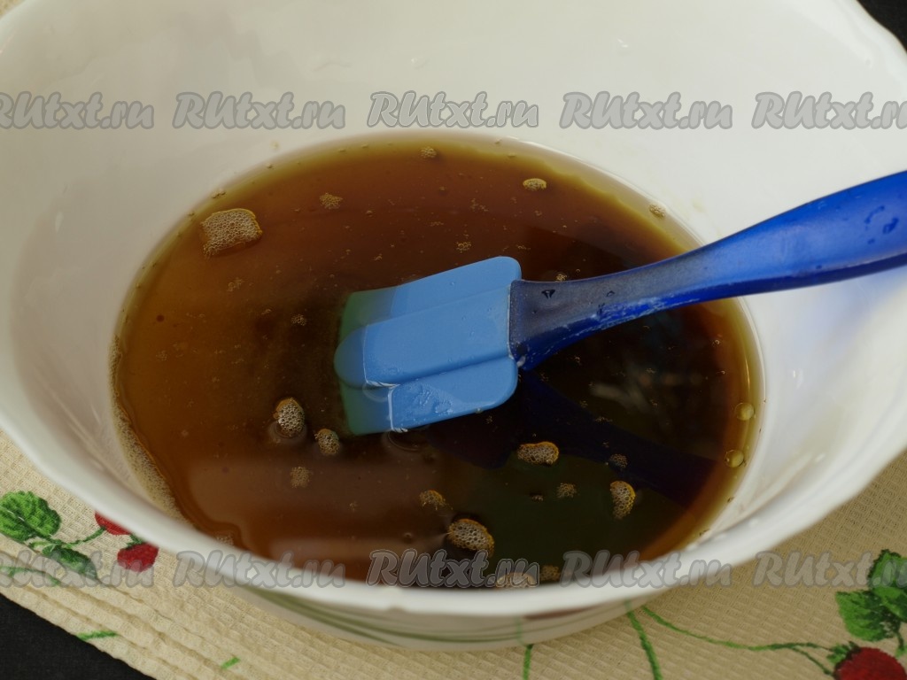 Чёрный чай или смесь чая залить кипятком и дать настояться, затем процедить. К чаю добавить сахар, варенье и рафинированное подсолнечное масло, хорошо размешать. Я использовала абрикосовое варенье с зёрнами из косточек, но сами зёрнышки в тесто не добавляла. Для коврижки лучше брать только жидкую основу варенья.