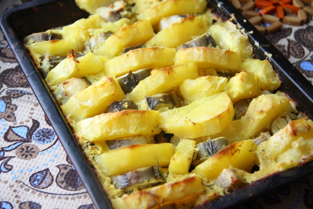 Залить картофель с рыбой кефирным маринадом и отправить в разогретую духовку. Запекать около 20 минут при температуре 180 градусов (до готовности картошки и рыбы).