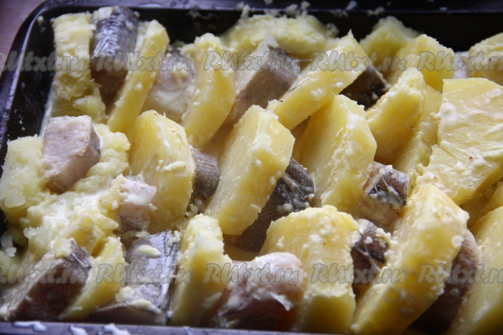 В форму для запекания, чередуя, выложить кусочки хека и картошку (как на фото).