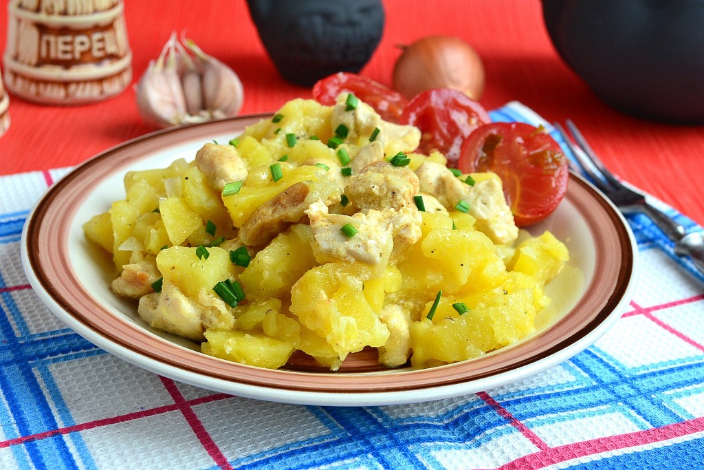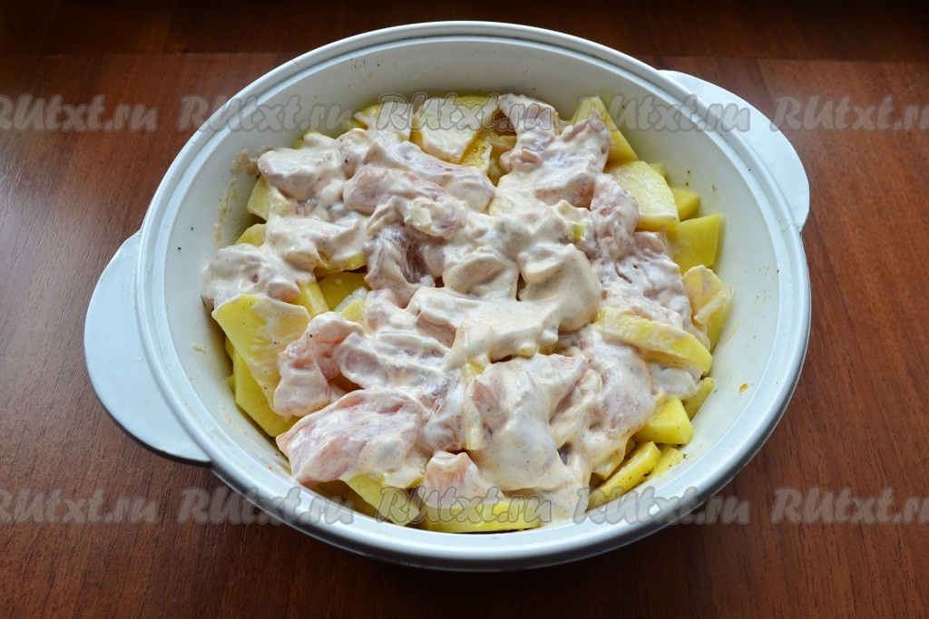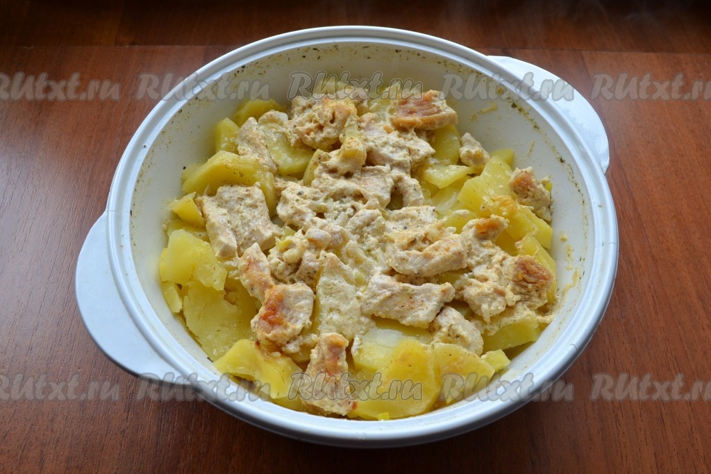 Тщательно курицу перемешать и выложить ее поверх картофеля с луком.