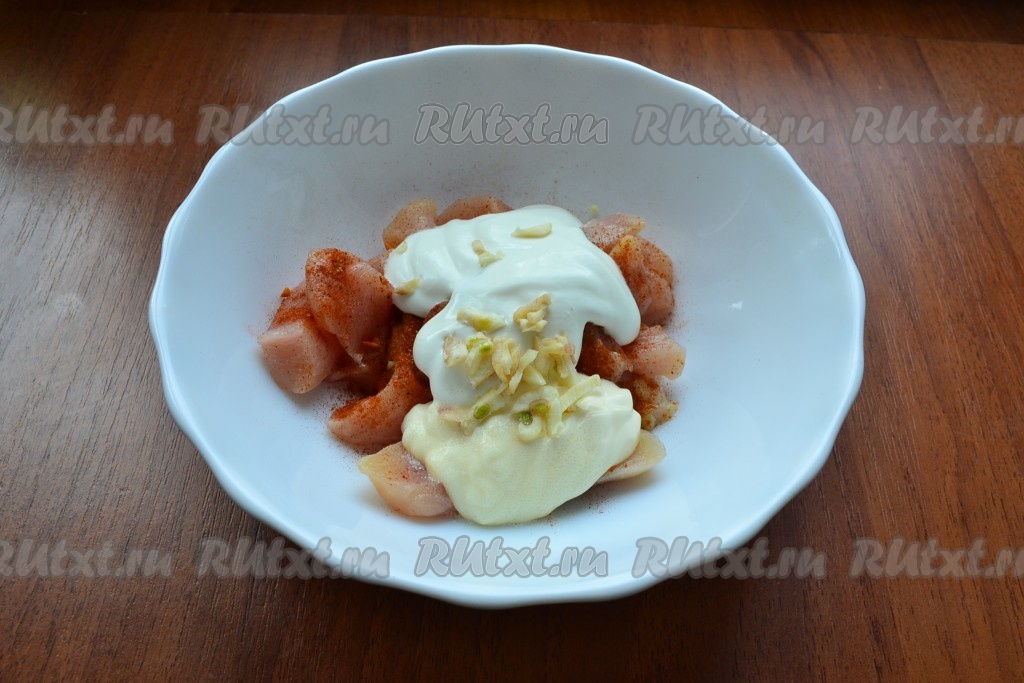 Добавить к куриному мясу сметану, майонез и измельченный чеснок.