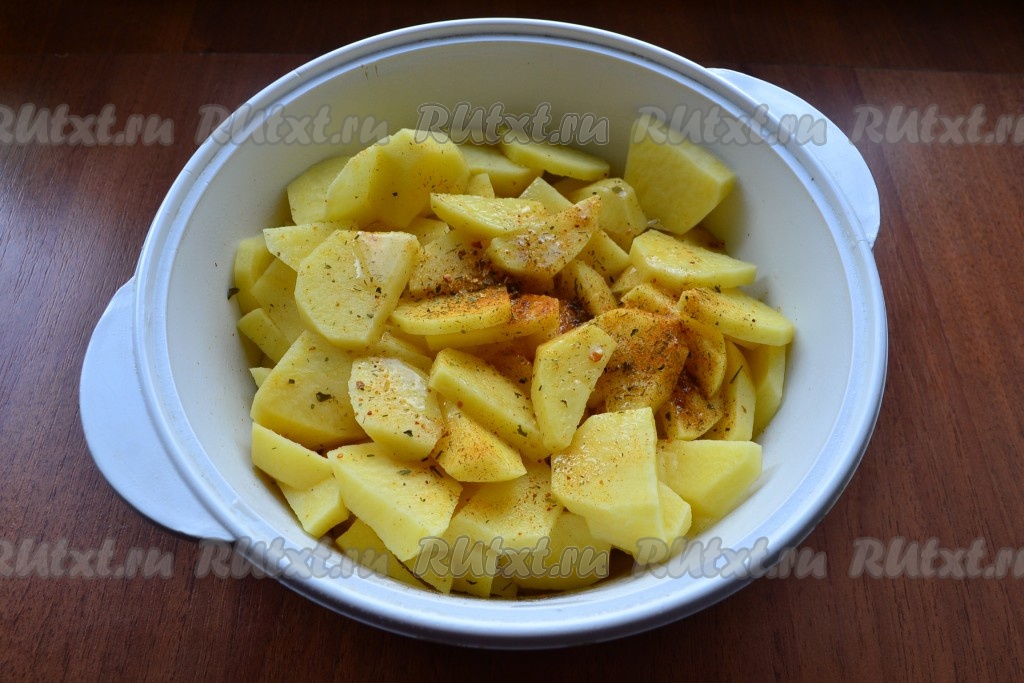 Картошку очистить, нарезать средними кусочками, поместить её в огнеупорную кастрюльку пригодную для приготовления в микроволновой печи. Посолить, посыпать специями для картофеля, влить растительное масло. Картофель перемешать.
