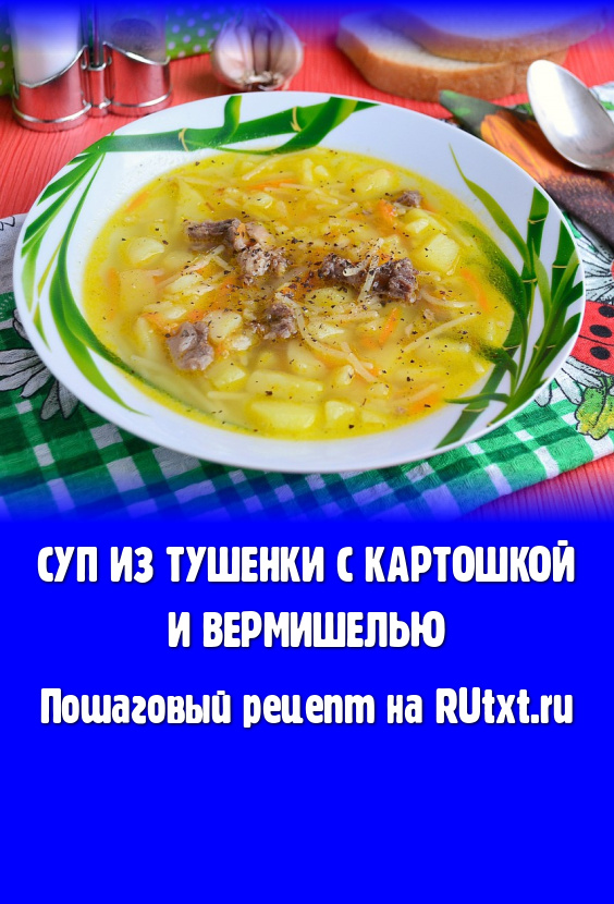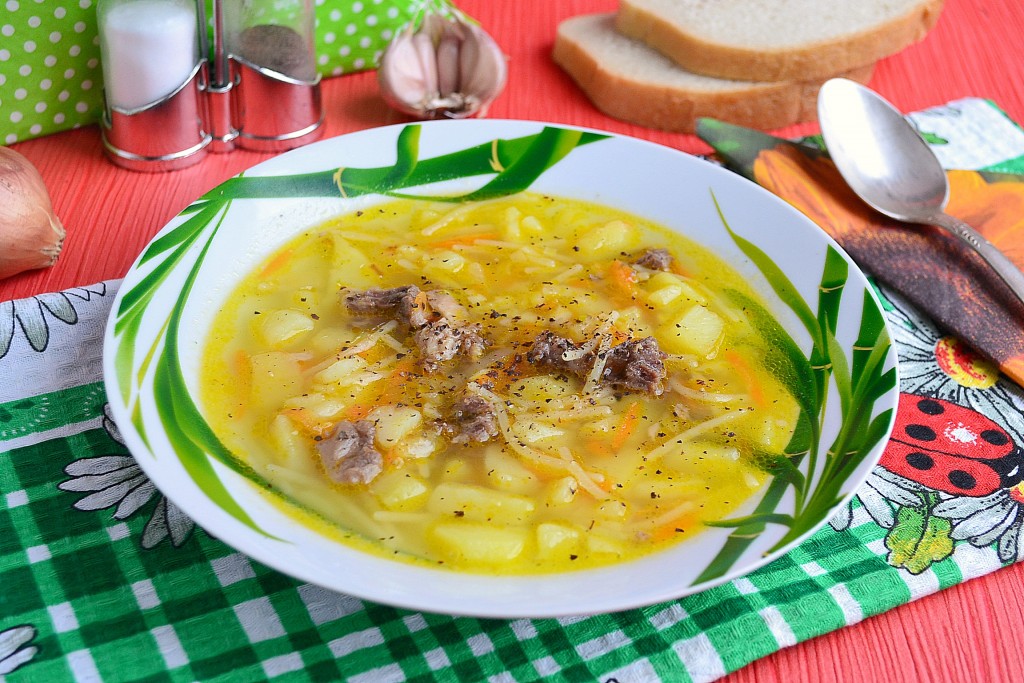 Суп из тушенки с картошкой и вермишелью - очень вкусное, сытное и насыщенное первое блюдо для вашего обеденного стола. Если у вас появилась баночка тушенки, обязательно приготовьте такой супчик, который понравится вам и вашим родным. Тушенку можно использовать свиную или говяжью.