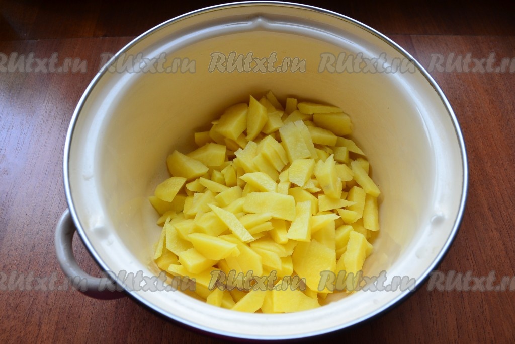 Очищенную картошку нарезать на небольшие кусочки, выложить в кастрюлю, залить водой. Поставить на огонь, довести до кипения и, посолив, варить 25 минут на слабом огне.
