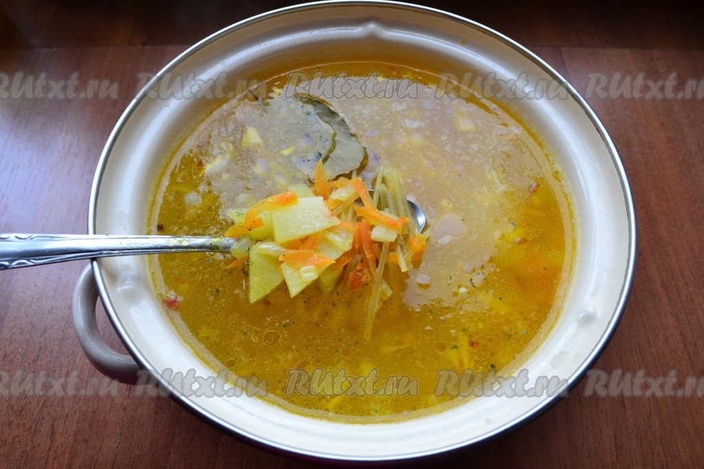 Когда картофель сварится, добавить в кастрюлю обжаренные лук с морковью, специи, приправу, лавровый лист и вермишель.