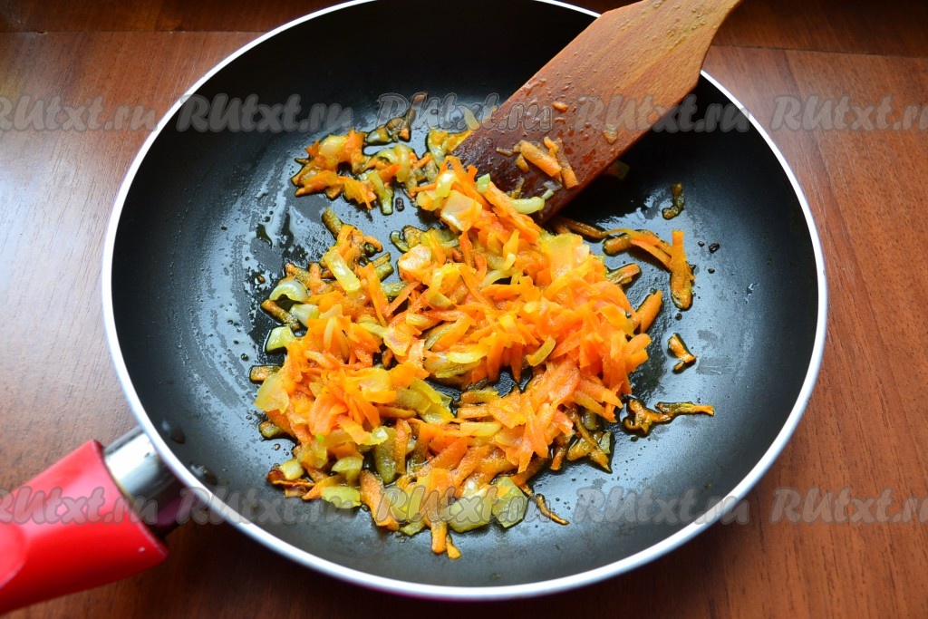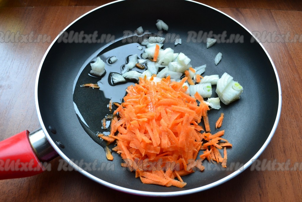 Лук и морковь очистить, лук нарезать кусочками, морковь натереть на крупной терке. Поместить морковку с луком в сковороду с подсолнечным маслом.