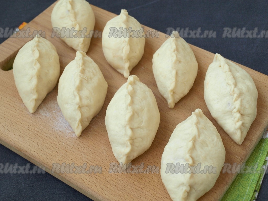 Готовое тесто разделить на 2 части, так легче будет лепить пирожки. Из одной части лепим, а вторую - прячем под полотенце, чтобы тесто не заветривалось. Одну часть теста делим на 8 равных кусочков.