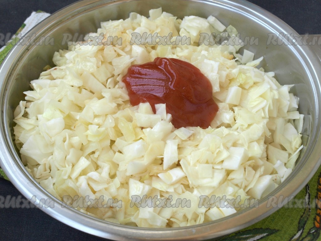 Добавить в сковороду томатный кетчуп или пасту (томатной пасты можно взять 1 столовую ложку и добавить столько же воды). Содержимое перемешать, накрыть крышкой и готовить минут 10-15 до мягкости, иногда перемешивая. Обязательно убавить огонь.