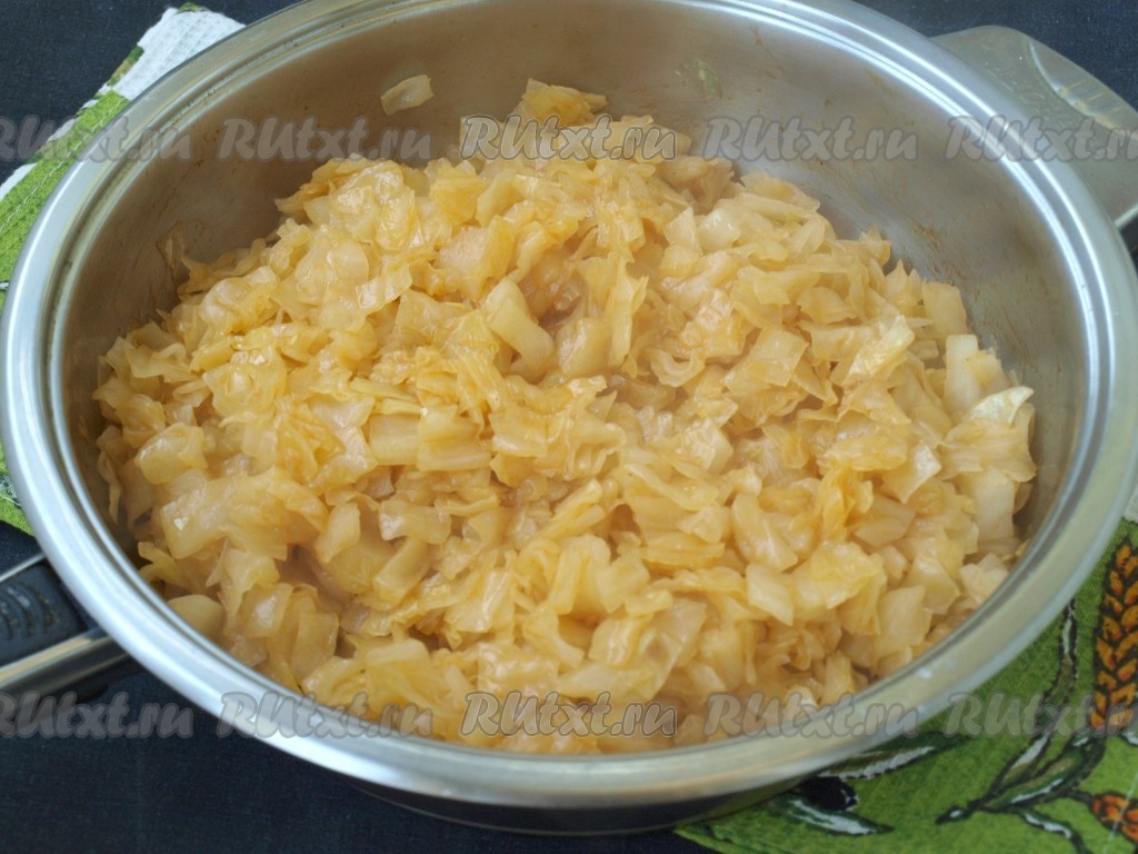 Нашинковать капусту "пелюстками" (кусочками размером 1х1 см). Такая нарезка лично мне больше нравится для начинки.