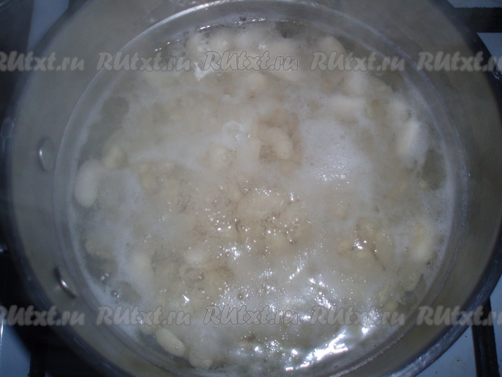 Затем воду слить, выложить фасоль в кастрюлю для варки и полностью залить свежей холодной водой. Не солить!