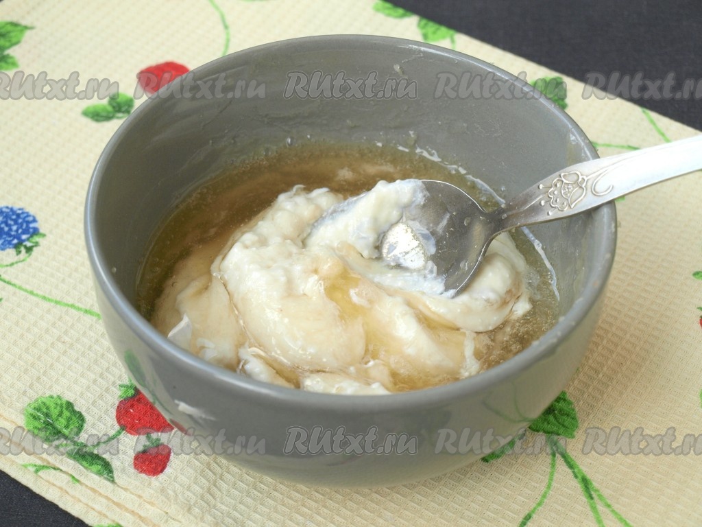 Желатин распустить на водяной бане, остудить до тёплого состояния, добавить в него немного получившейся творожной массы и перемешать.