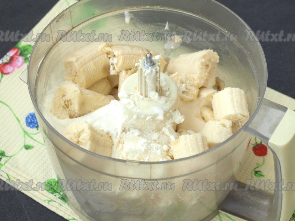 В чашу комбайна выложить творог, сметану, сахар и бананы. Взбить до однородной массы.