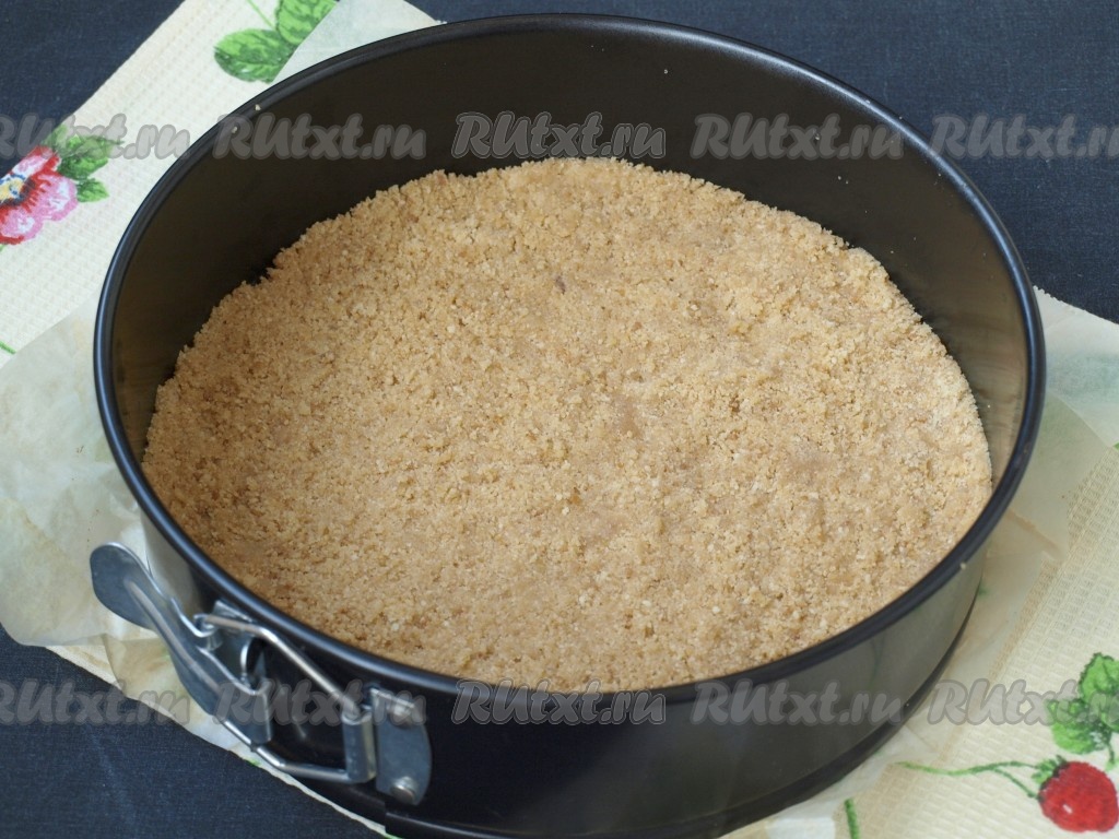 Дно формы (у меня форма диаметром 22 см) проложить пергаментом, выложить крошку, хорошо утрамбовать и на 30 минут убрать в холодильник.