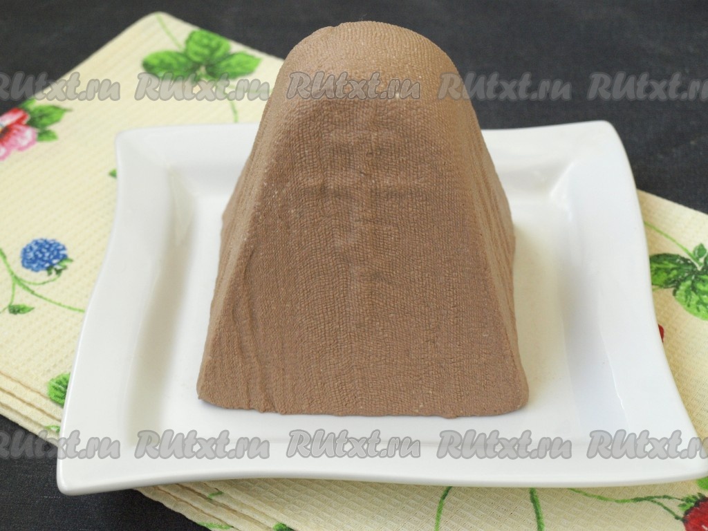 Затем пасху перевернуть на тарелку и снять марлю.