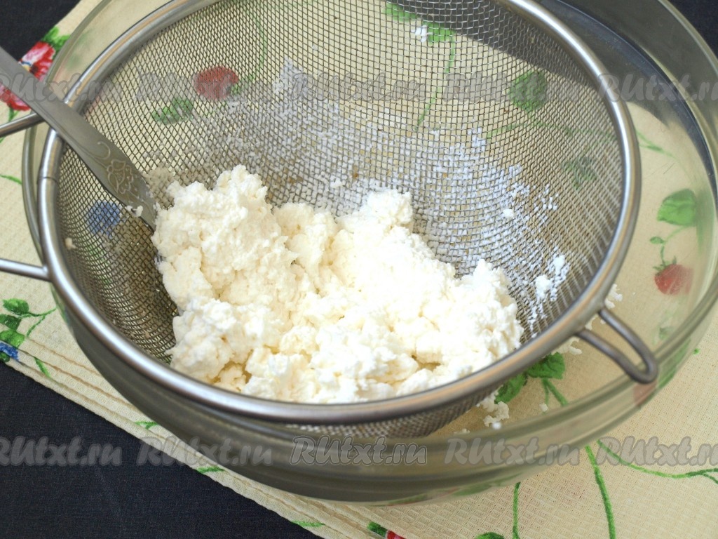 Мягкий творог протереть сквозь сито.