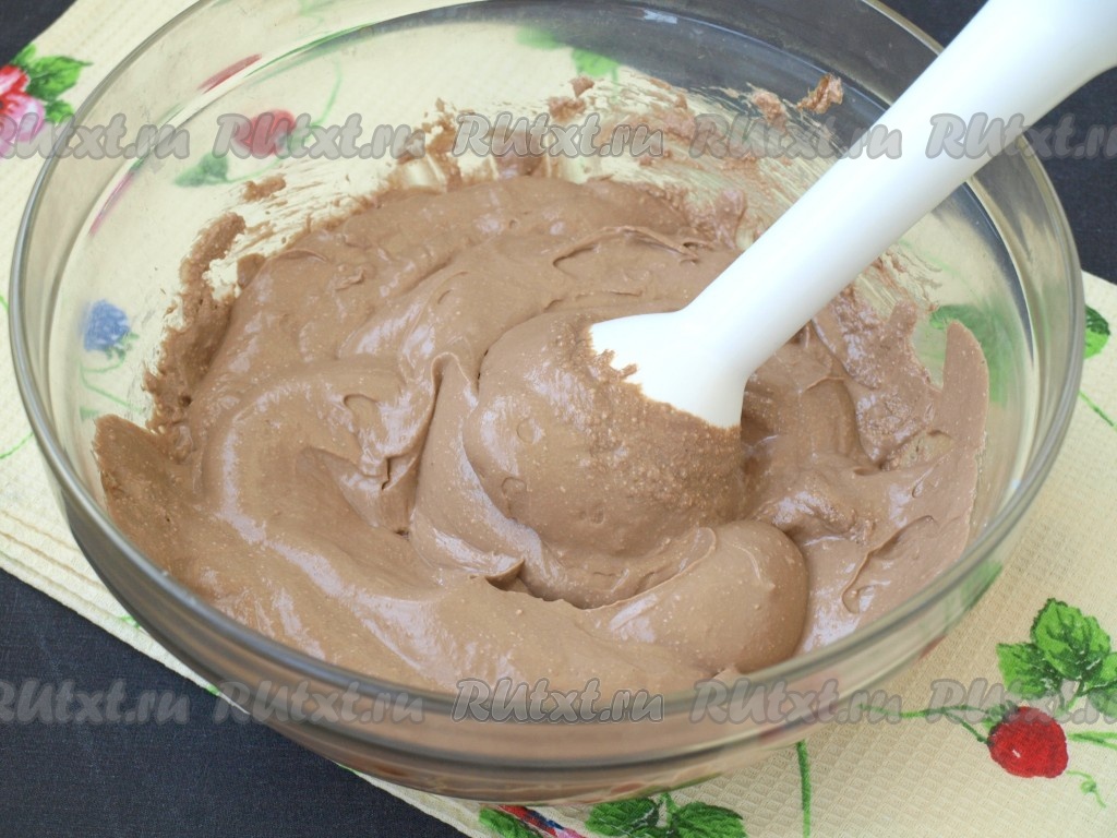 Остывшую шоколадно-сливочную массу соединить с творожной и взбить погружным блендером до однородного состояния.