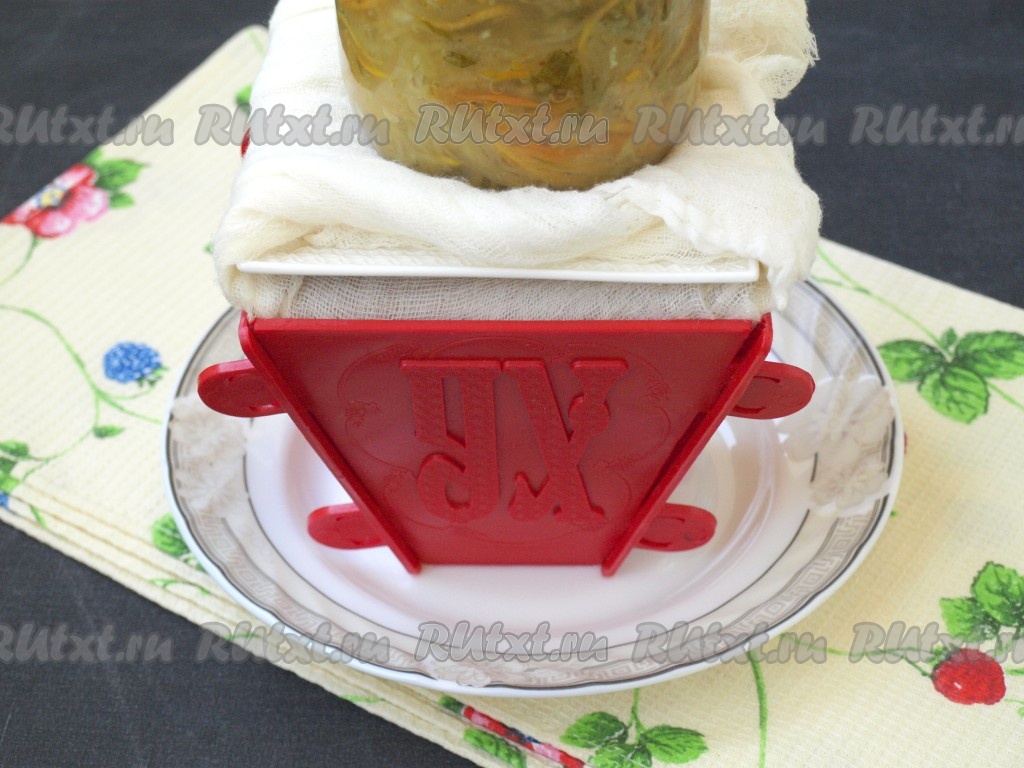 Подвернуть края марли наверх, накрыть блюдцем. Сверху поставить груз в виде банки с водой (или любой заготовкой). Банка должна быть 0,5 литра. Всю эту конструкцию поставить в холодильник на сутки. За это время 2-3 раза из тарелки сливать стекающую сыворотку.