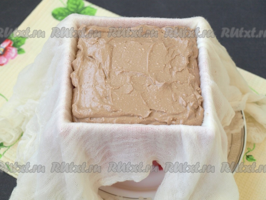 Пасочницу поставить в тарелку, застелить марлей в 2-3 слоя так, чтобы края марли свисали с краёв пасочницы, и выложить творожную массу.