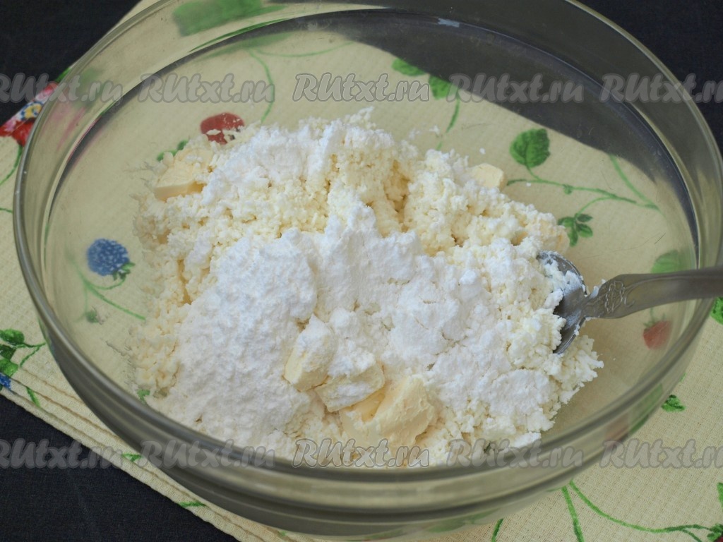 К творогу добавить мягкое сливочное масло и сахарную пудру, тщательно размешать.