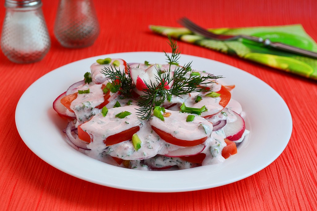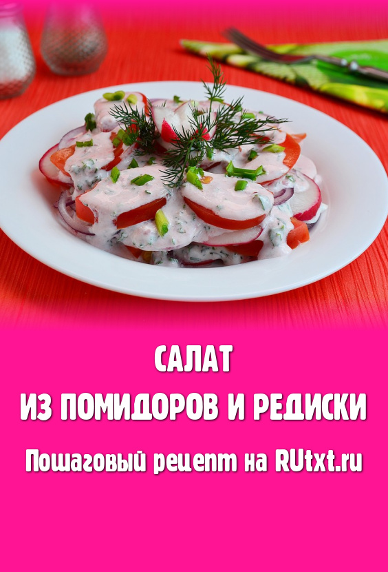 Затем слои повторить 1-2 раза. Сверху полить салат заправкой и, по желанию, поперчить черным свежемолотым перцем и посыпать измельченным зеленым луком или чесноком. Очень вкусный и необычный салат из помидоров и редиски готов! Сразу же подать салат к столу.