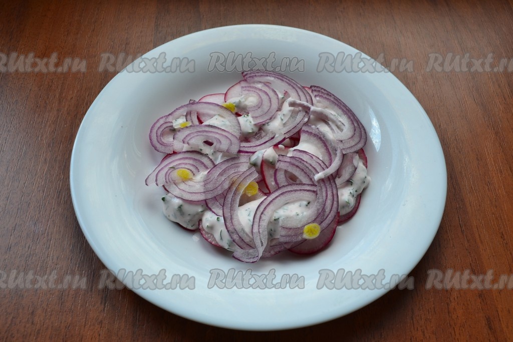 Полить редис частью заправки. Затем сверху выложить слой нарезанного тонкими полукольцами фиолетового лука.