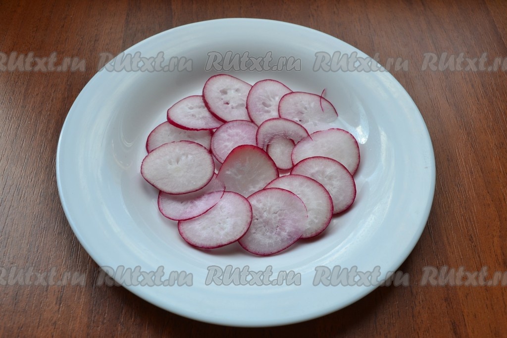 Редис нарезать тонкими кружочками, выложить на плоскую тарелку одним слоем.