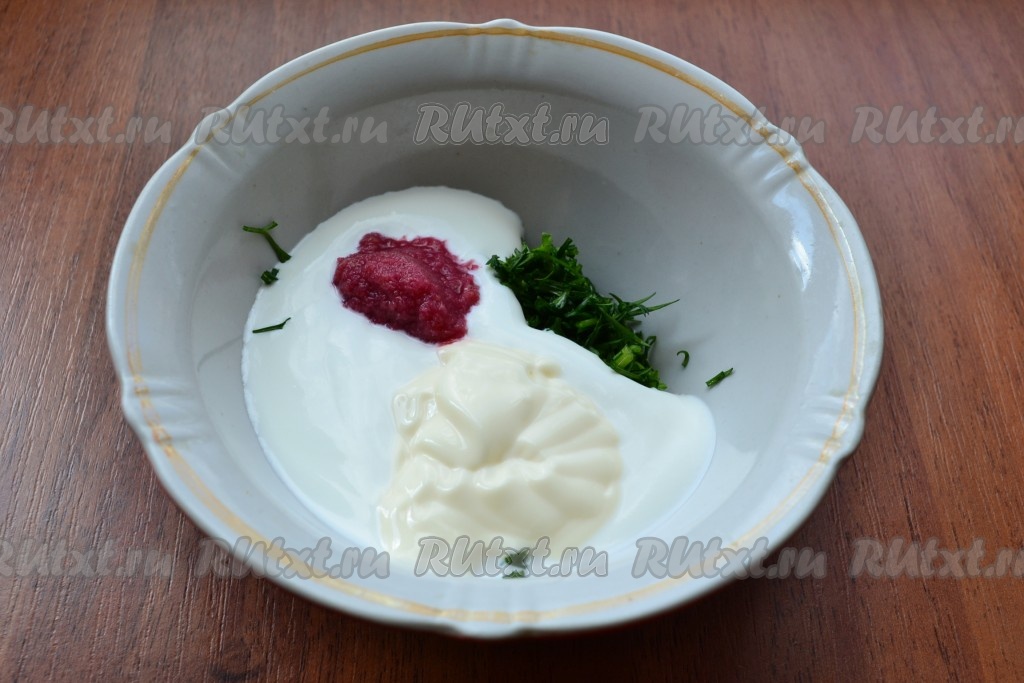 Приготовить заправку: зелень укропа и петрушки измельчить, добавить к ней сметану, майонез, хрен и соль по вкусу, тщательно перемешать.