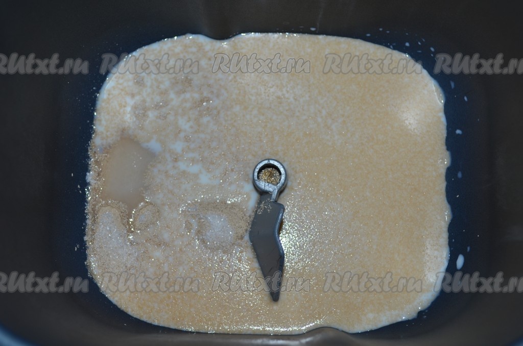 Возьмем все продукты комнатной температуры. Теплое молоко вылить в чашу хлебопечки (или, если замешиваете тесто вручную, в отдельную ёмкость), добавить туда же дрожжи и 3 чайные ложки сахара, перемешать и оставить опару минут на 15 (до появления пышной шапочки).