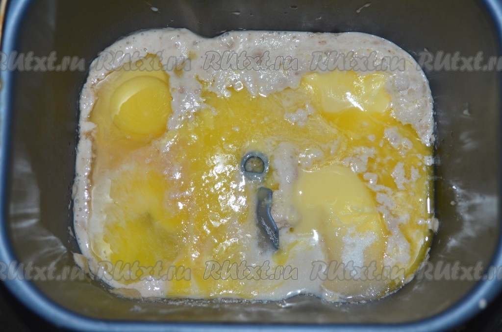 Затем в подошедшую опару добавить яйца, оставшийся сахар, размягченное масло, соль, коньяк, сгущенное молоко и включить режим замешивания теста (в моей хлебопечке он составляет 14 минут). Если замешиваете тесто вручную, то в отдельной ёмкости к подошедшей опаре добавить яйца, сахар, размягченное масло, соль, коньяк, сгущенное молоко и начать замешивать сначала ложкой, потом, после постепенного добавления муки, руками.