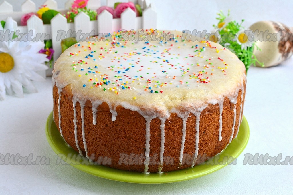 Затем кулич смазать любой глазурью и посыпать кондитерской присыпкой. Оставить выпечку на 8-10 часов для созревания.