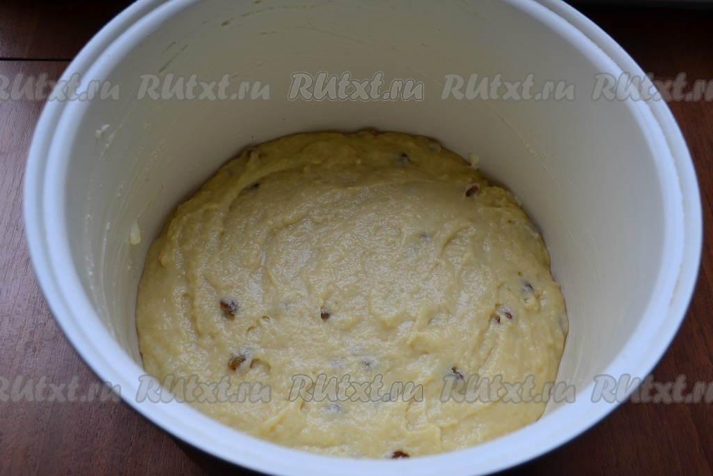 Тщательно тесто перемешать ложкой. Чашу мультиварки хорошо смазать сливочным маслом, на дно поместить пергамент. Выложить подготовленное тесто в чашу, разровнять.