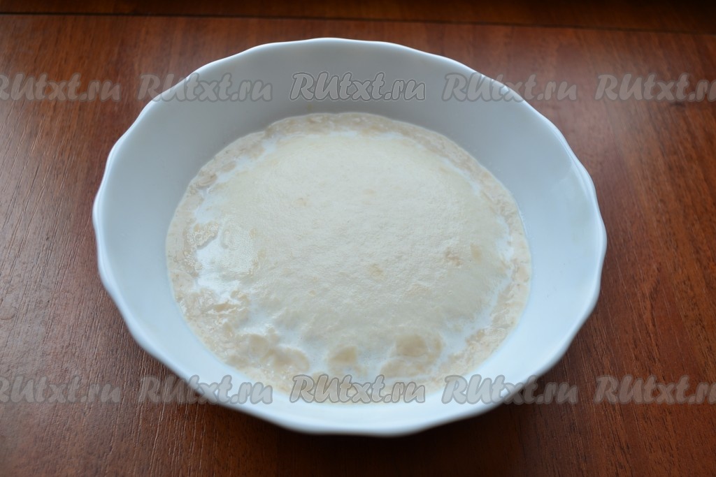 В теплом молоке растворить 1 столовую ложку сахара и свежие дрожжи (или всыпать сухие). Накрыть посуду со смесью пленкой и оставить в теплом месте на 15 минут.