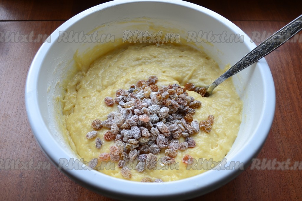 Тесто получится по консистенции чуть гуще, чем на оладьи. В тесто добавить изюм, перемешанный с небольшим количеством муки.