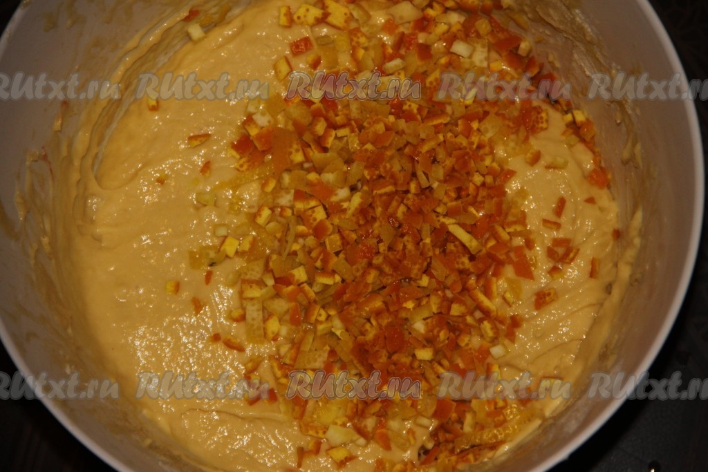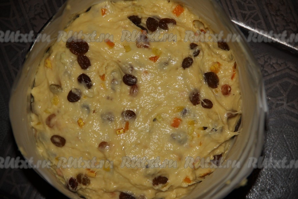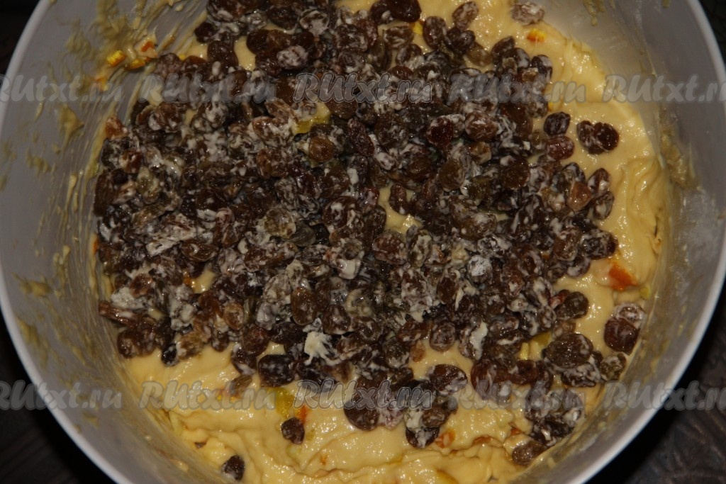 Следом за цукатами добавляем вымоченный в течение часа изюм. Изюм можете заранее вымочить в кипятке или в алкоголе, а перед добавлением в тесто отжать от лишней жидкости.