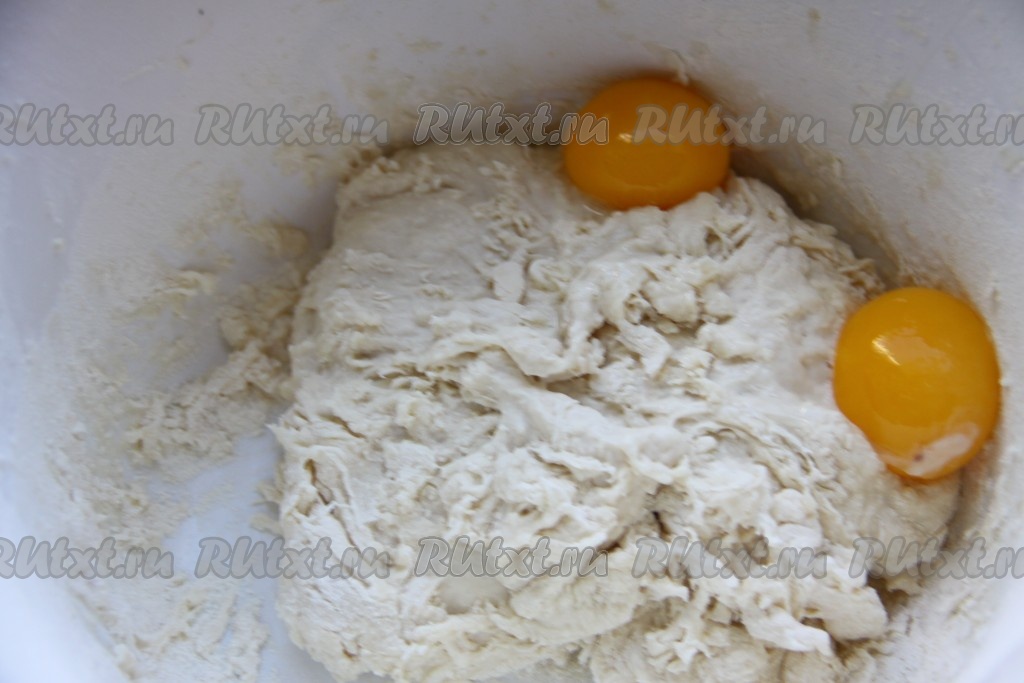 Добавляем к тесту муку, соль и мед, хорошенько вмешиваем. Затем добавляем сахар, по одному желтку, ароматизаторы и растопленное (не горячее) сливочное масло. Вымешиваем тесто около часа. Тесто изначально слегка липнущее к рукам, но после тщательного замеса, оно становится пластичным, как вытяжное тесто для штруделя.