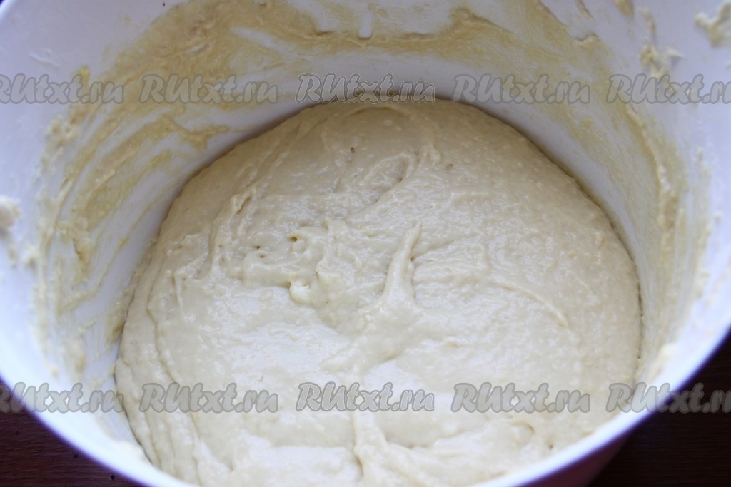 Когда тесто начнет отставать от стенок посуды, добавляем сахар и масло комнатной температуры. Продолжаем тесто вымешивать, пока оно не станет гладким.