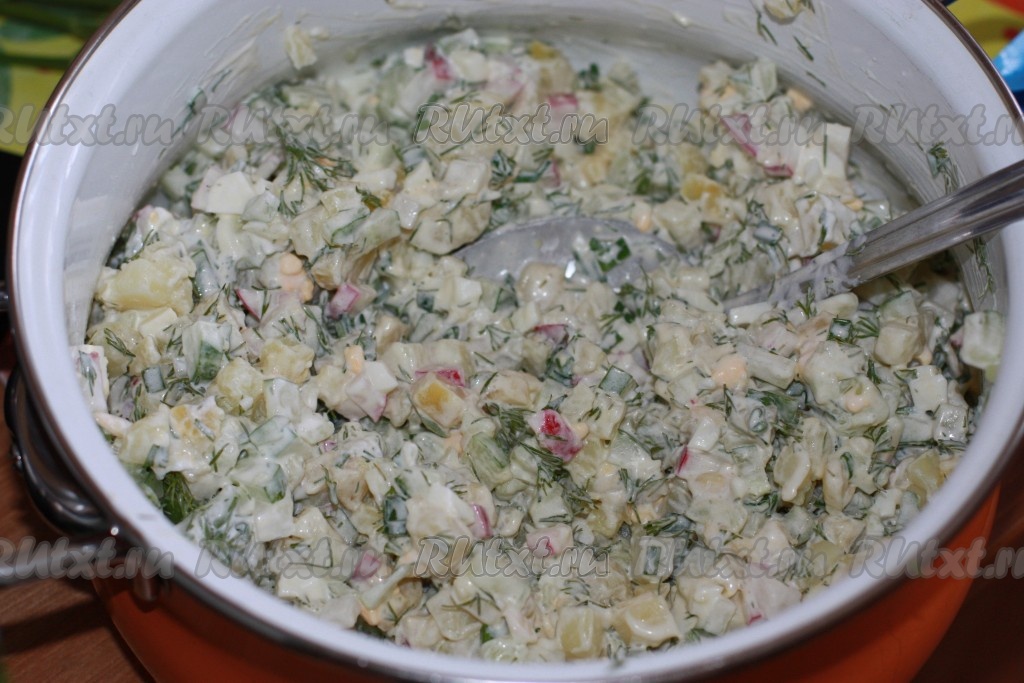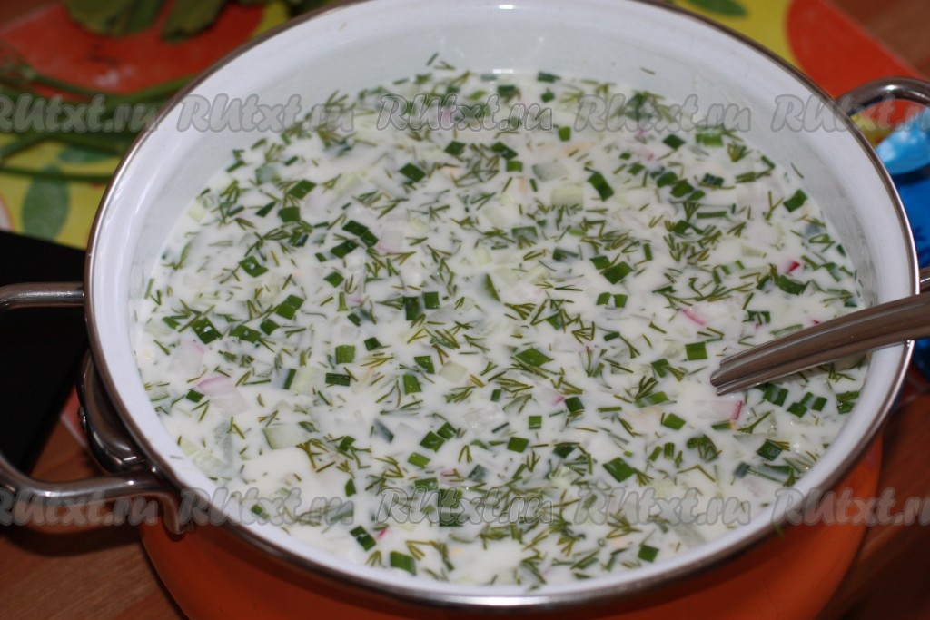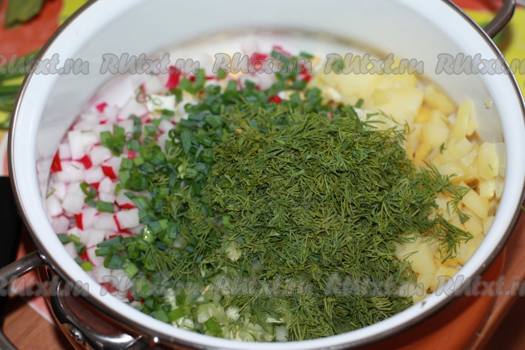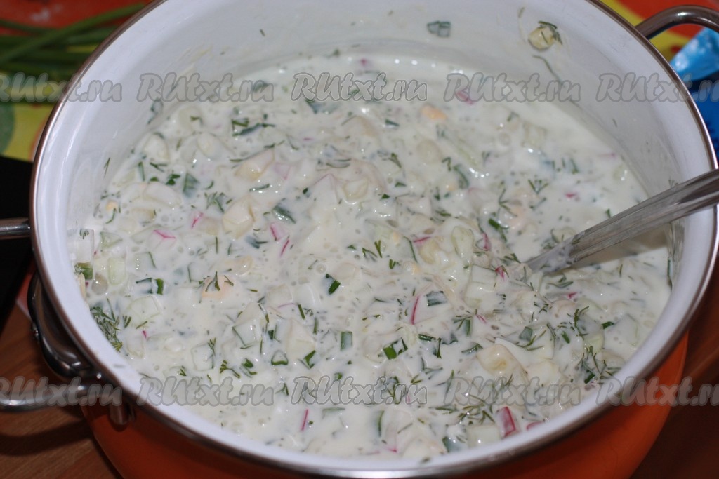 Помешивая, постепенно добавлять воду, тем самым регулируя густоту окрошки.
