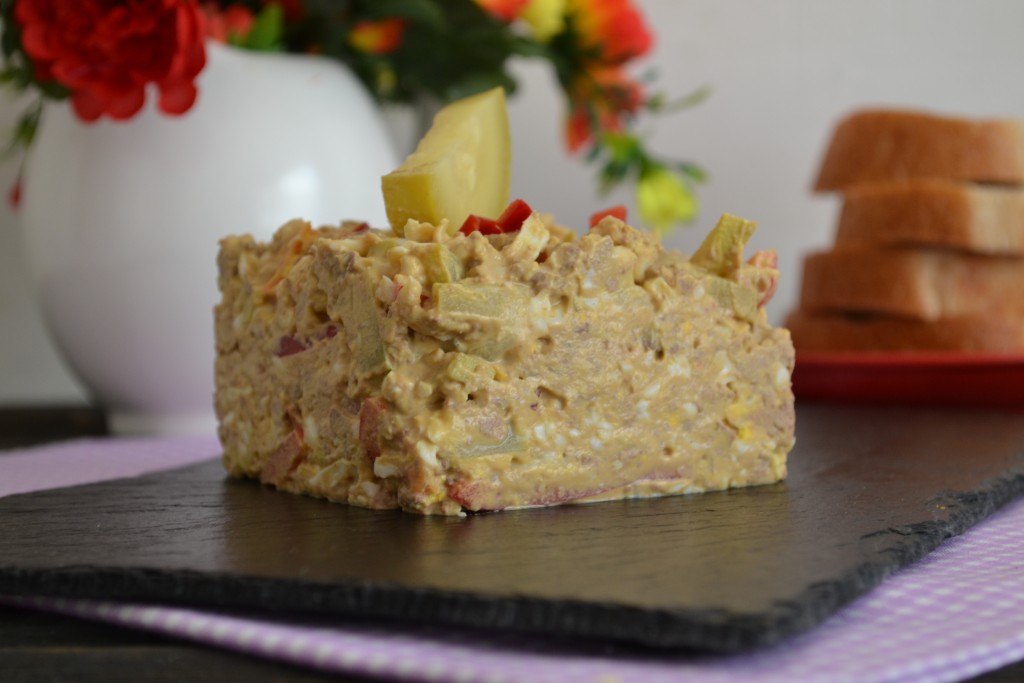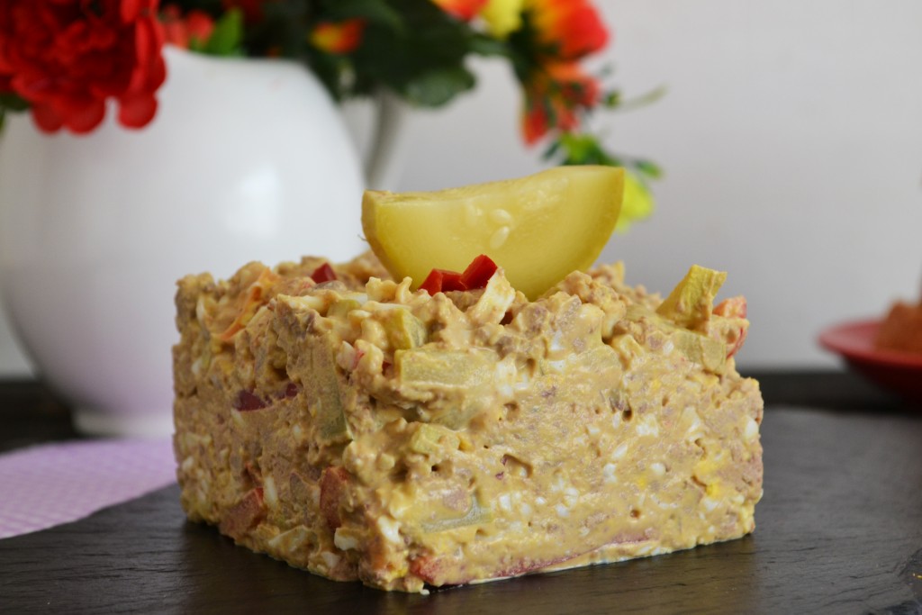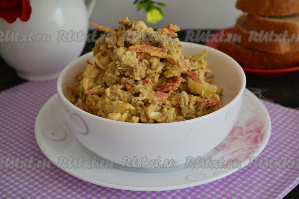 Вкусный, нежный, сытный салат из консервированных кабачков сразу же подать к столу.