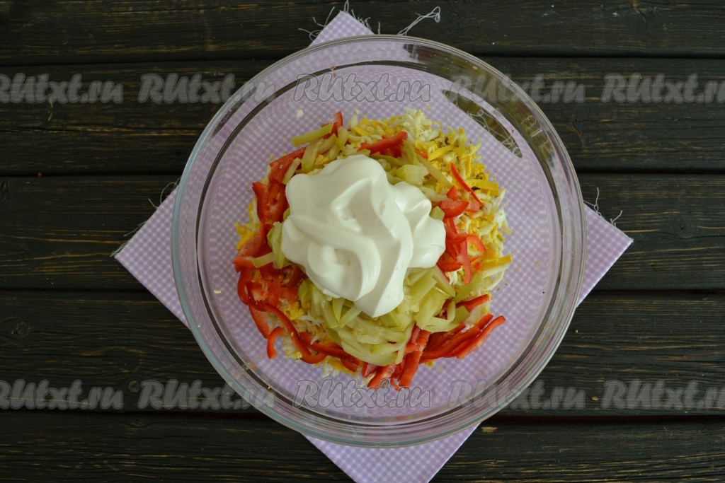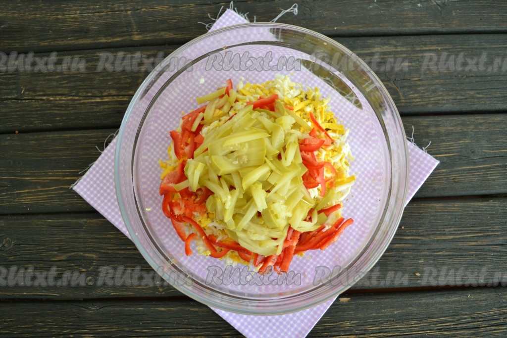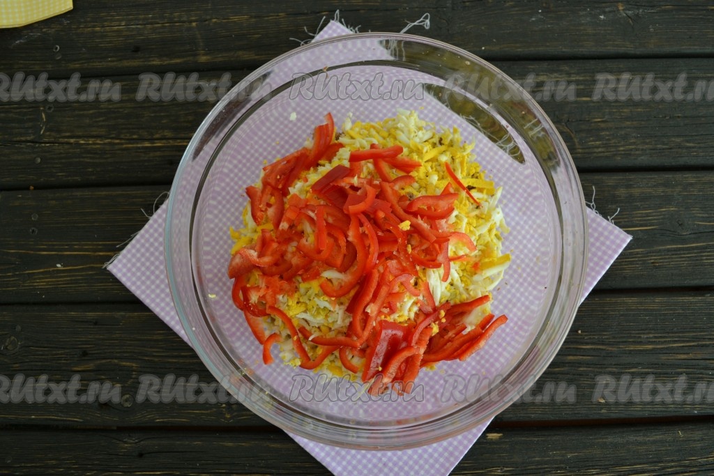 Сладкий перец, очищенный от плодоножки и семян, нарезать тонкой соломкой и выложить в салат к печени и яйцам.